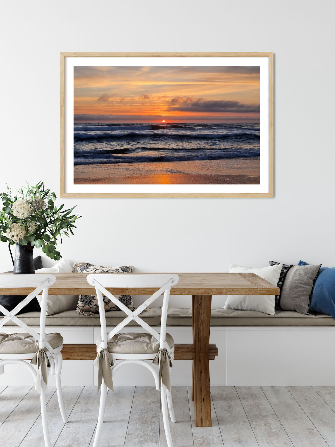 Printed on radiance satin premium photo paper using Epson large-format printers, ensuring your sunrise is vibrant and doesn’t fade over time. Available in raw oak, white or black frames.