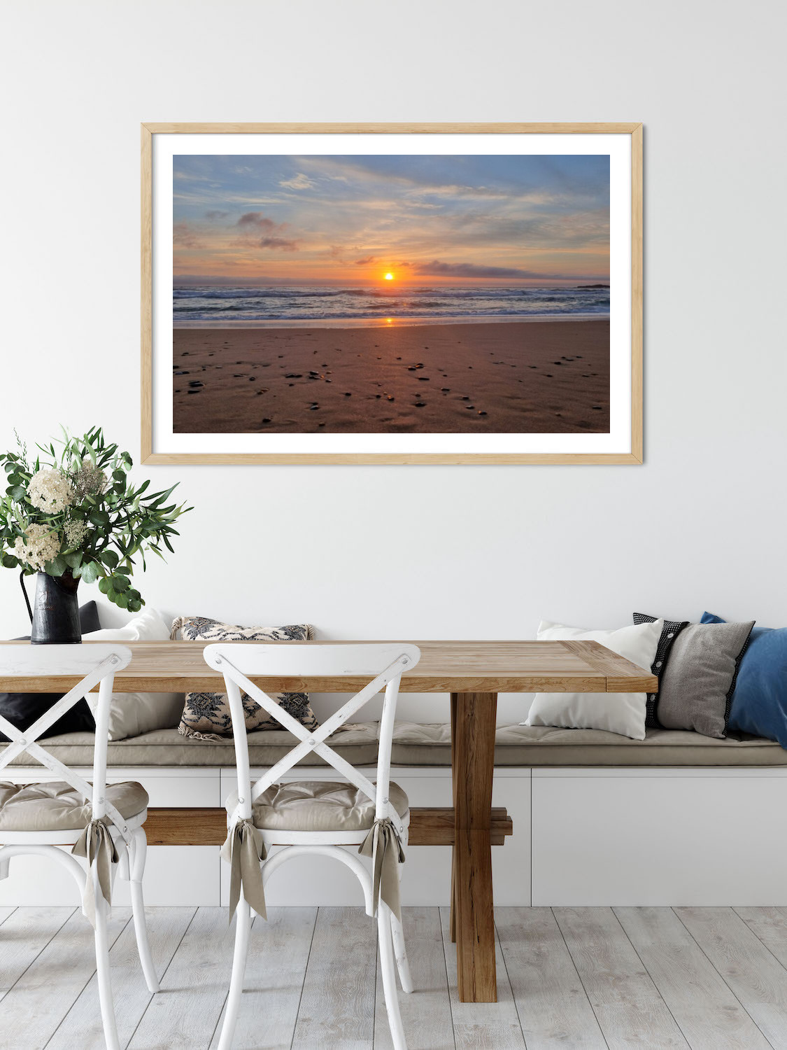 Printed on radiance satin premium photo paper using Epson large-format printers, ensuring your sunrise is vibrant and doesn’t fade over time. Available in raw oak, white or black frames.